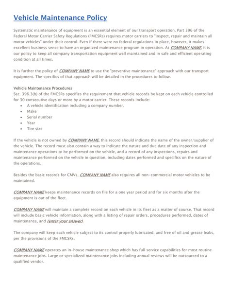 sample vehicle maintenance policy